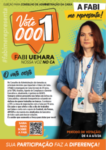 Todas as empregadas e todos os empregados da ativa, tanto das agências quanto das unidades administrativas, têm direito a participar e votar na candidata Fabiana Uehara número 0001.