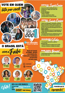A Contraf-CUT, junto com a FETEC-CUT/SP e sindicatos de sua base, reafirma seu apoio à candidatura de Fabiana Uehara, que representa as empregadas e os empregados da Caixa com responsabilidade, competência e compromisso com as empregadas e empregados e histórico de luta em defesa de melhores condições de trabalho e de um banco 100% público e socialmente engajado. Ao longo de seu mandato, Fabi tem levado ao banco demandas do pessoal da Caixa, como o adoecimento mental e as metas abusivas; o fortalecimento do Saúde Caixa; defesa de contratações, combate ao fechamento de unidades e proteção da caráter público da Caixa.