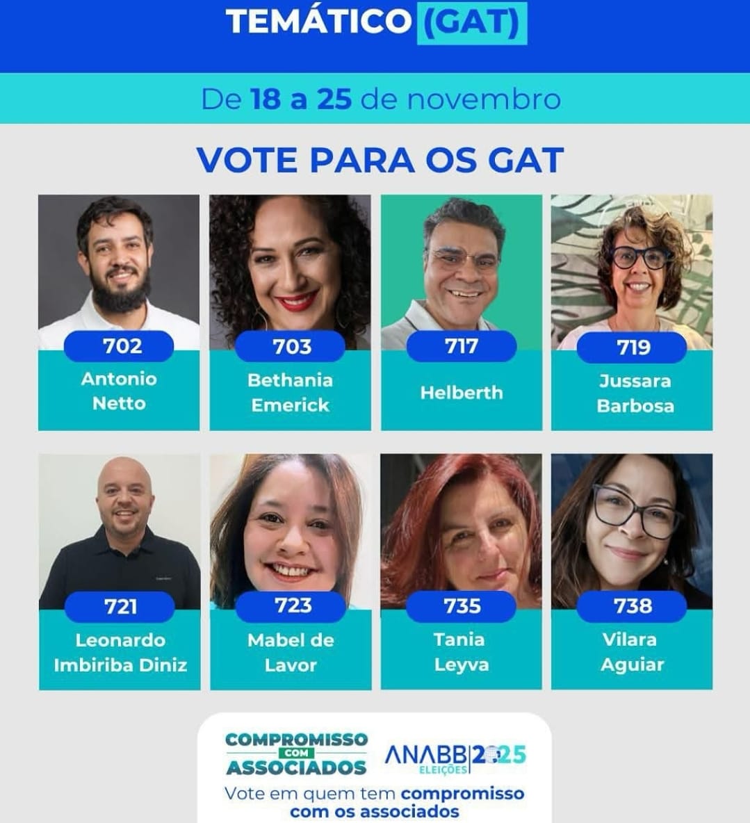 Poderão votar os sócios efetivos pós‑98 em dia com suas contribuições, exclusivamente por via eletrônica no portal da ANABB (Espaço do Associado). Cada eleitor poderá votar em até oito postulantes, um para cada GAT abaixo: