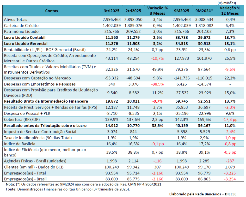 O Itaú Unibanco registrou um lucro líquido gerencial de R$ 34,5 bilhões nos nove primeiros meses de 2025, alta de 13,1% em relação ao mesmo período do ano passado, segundo levantamento do Dieese com base nas demonstrações financeiras do banco. O resultado confirma a trajetória de crescimento dos lucros e da rentabilidade da instituição, que atingiu 23,9% sobre o patrimônio líquido.